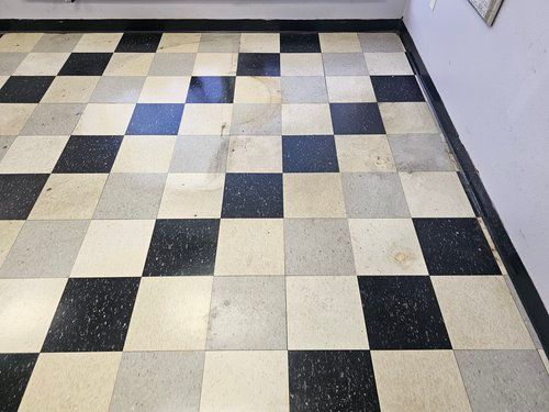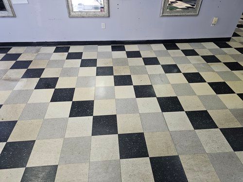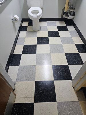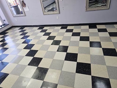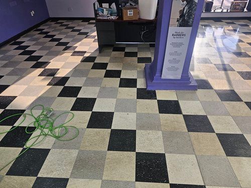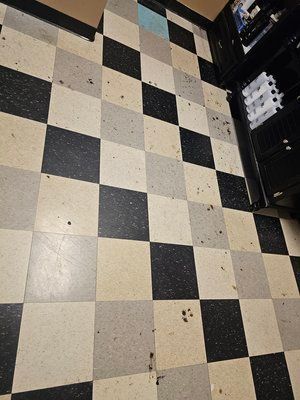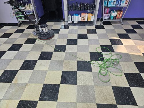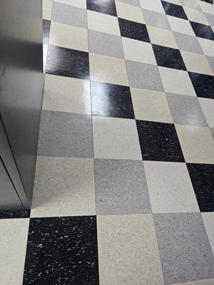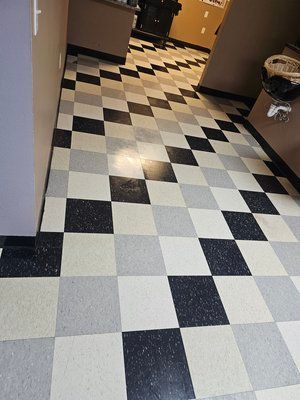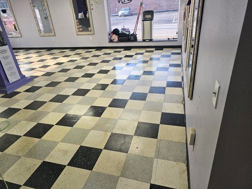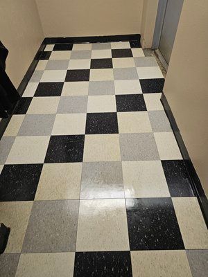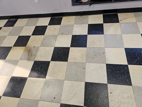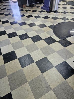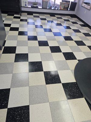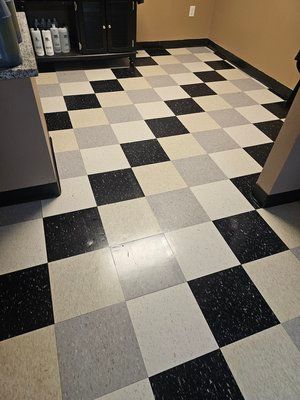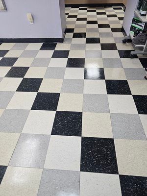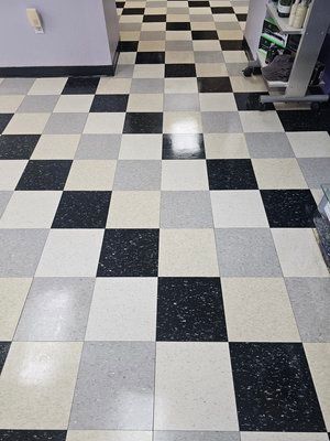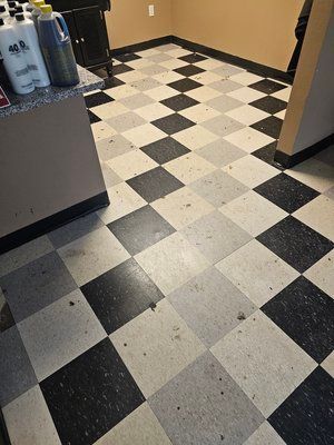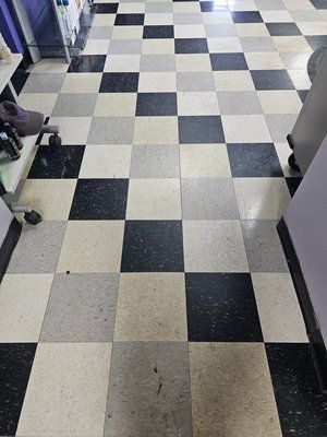 This floor was covered in hair dye, dirt, and old wax. We stripped the wax (2x to be sure), removed all the hair dye, and sealed the floor with our BallistiX Ranger Sealant. It is slip resistant, expands with the VCT through the seasons, and allows hair dye to be wiped up with water or simple cleaners.