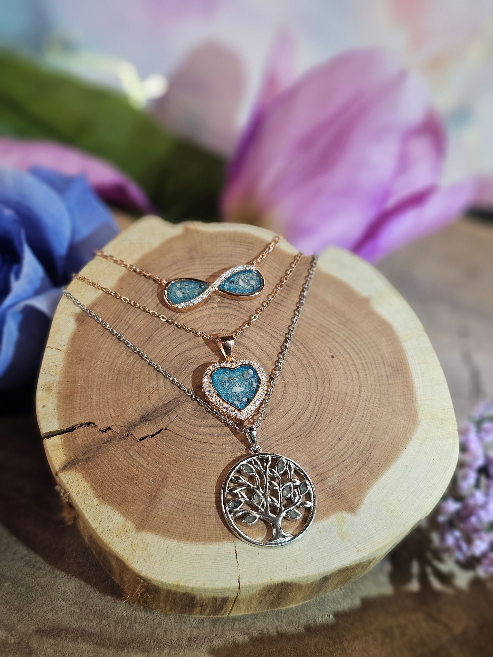 Cremation Jewelry is a wonderful way to keep your loved ones with you. Our jewelry and design options range from classic to bold, colored or neutral, with designs for both people and pets. We need very little ash to create our keepsakes. Once we receive the ash, we will go over design preferences and get to work right away. Any of our jewelry here that is done in breastmilk can also be used with ashes.