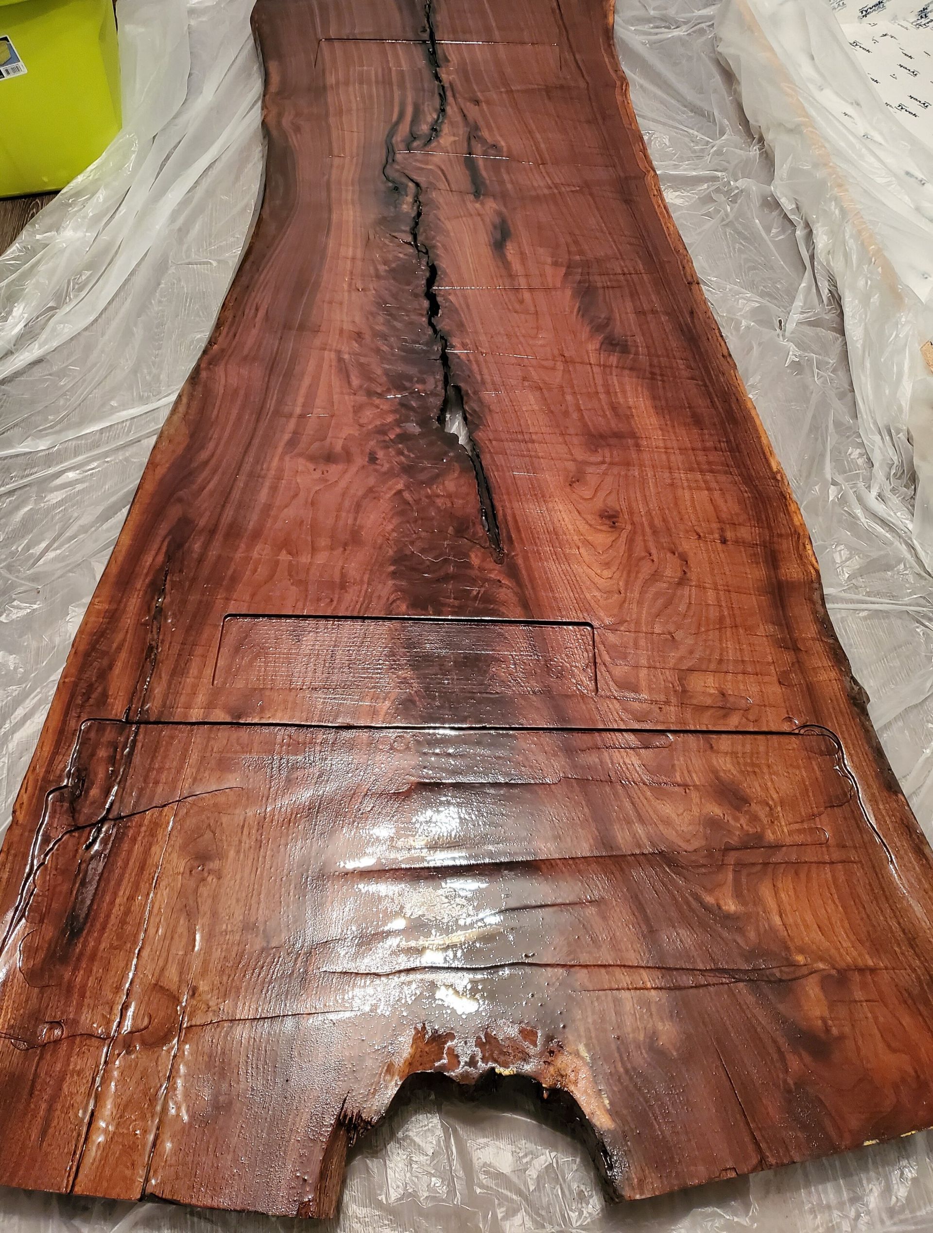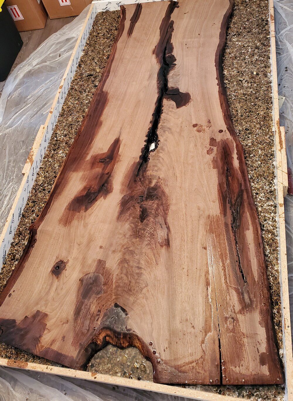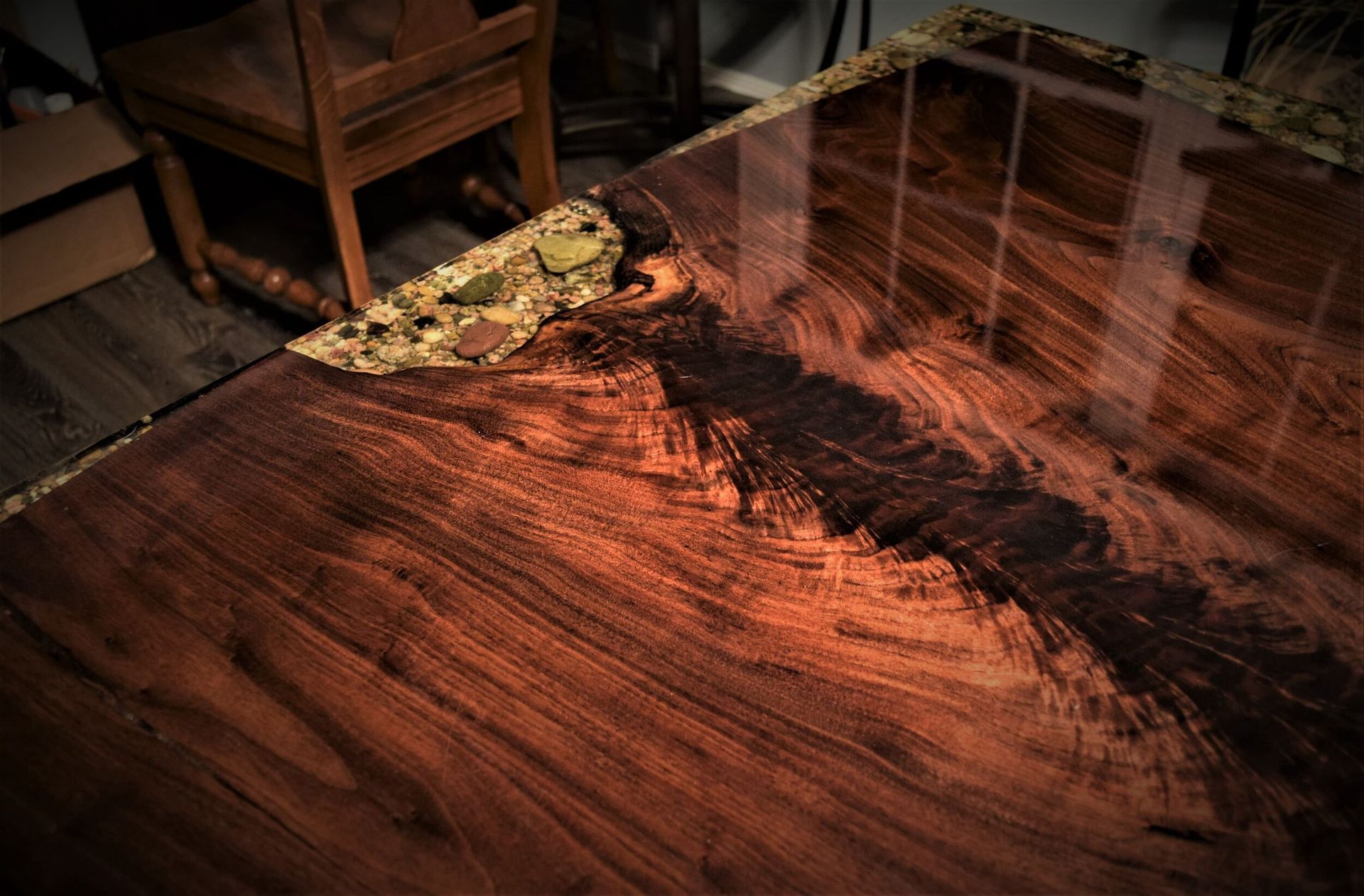 Stunning, highly figured curly burl black walnut cookie piece finished with a satin black epoxy center. Protected with BallistiX CounterAttack PLUS. This was an absolute one of a kind piece. We don’t come wood that is this beautiful every day!