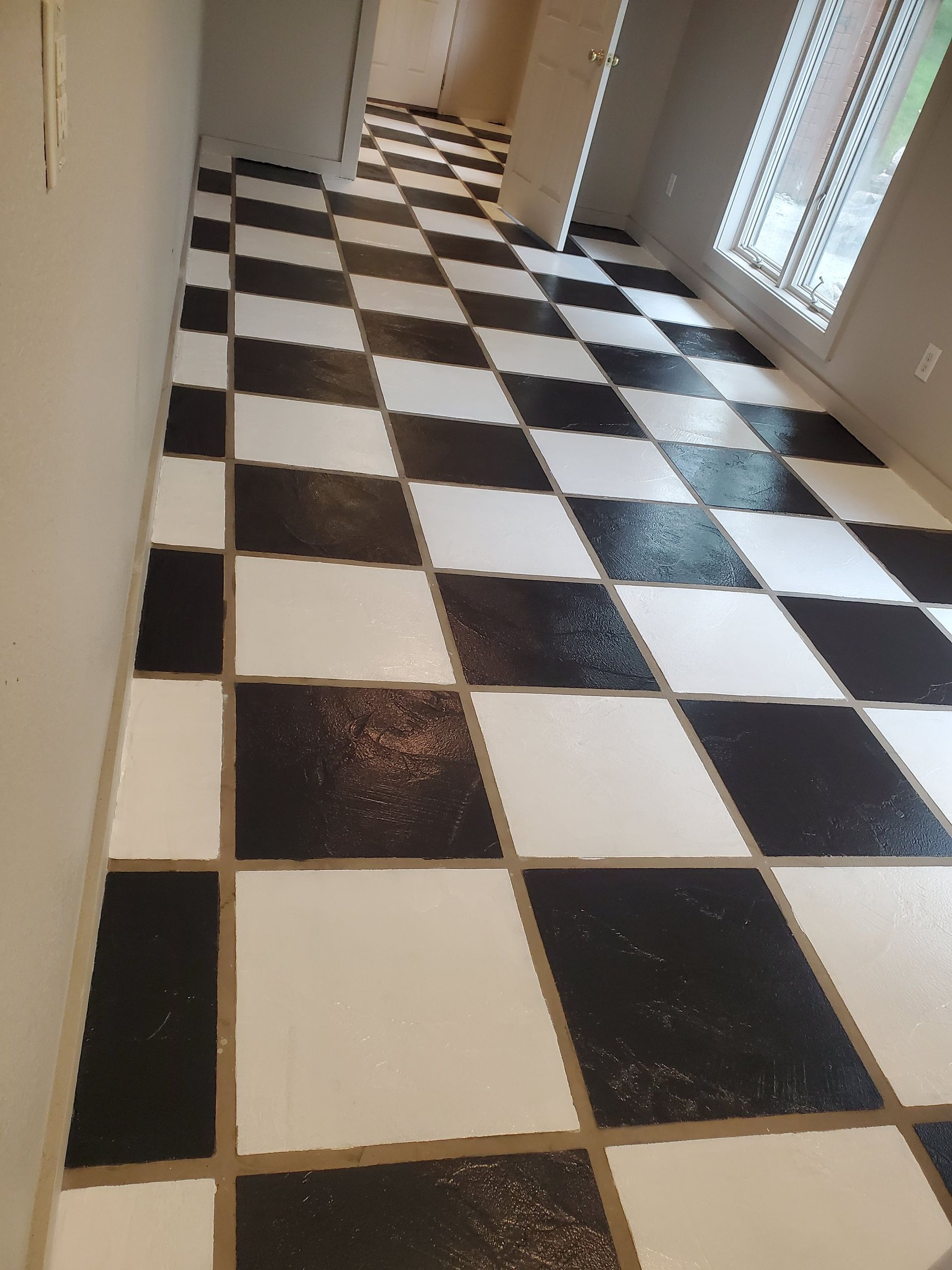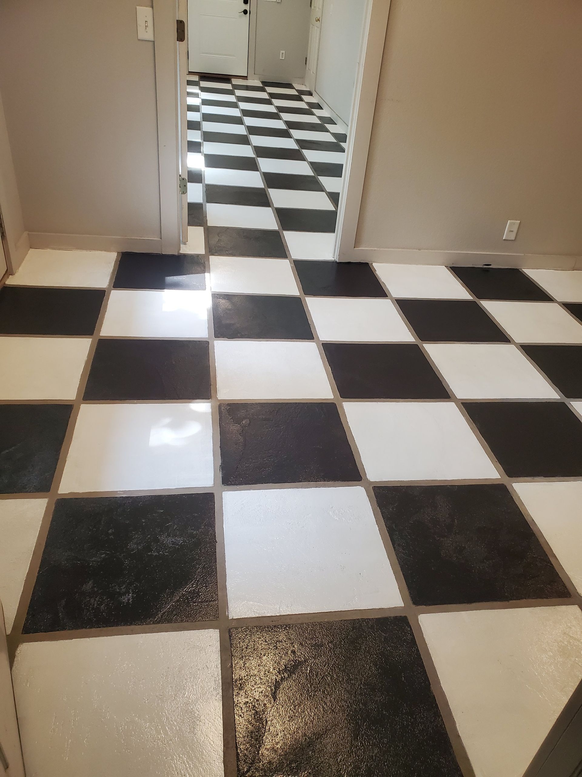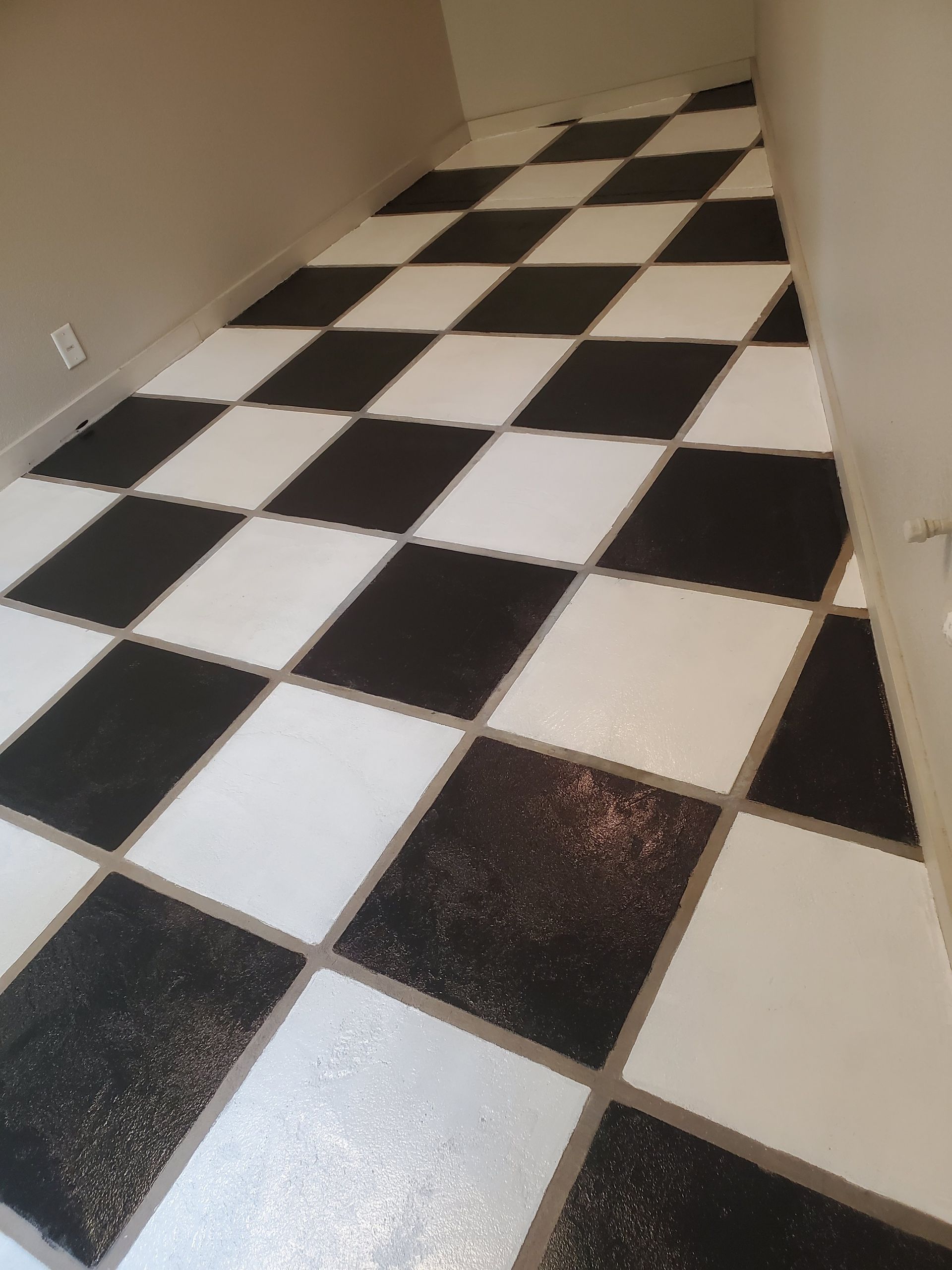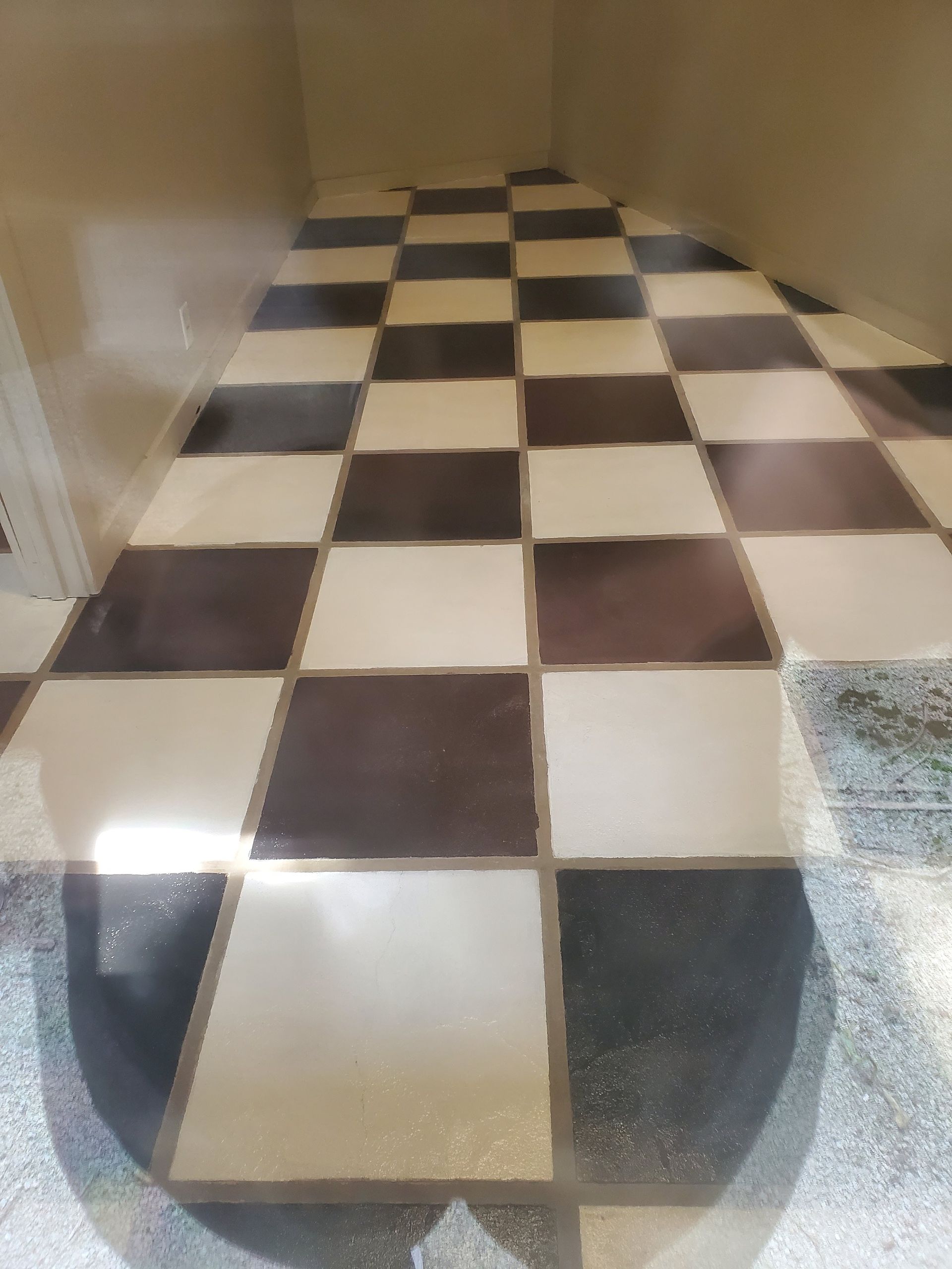 This floor was a Black and White concrete overlay that was completed years ago. We came in and returned the Black to being Black and the White to being White. Then we protected the refurbishment with our BallistiX CounterAttack Topcoat. We added in an antislip additive since this floor was in the boat house of Table Rock Lake.
