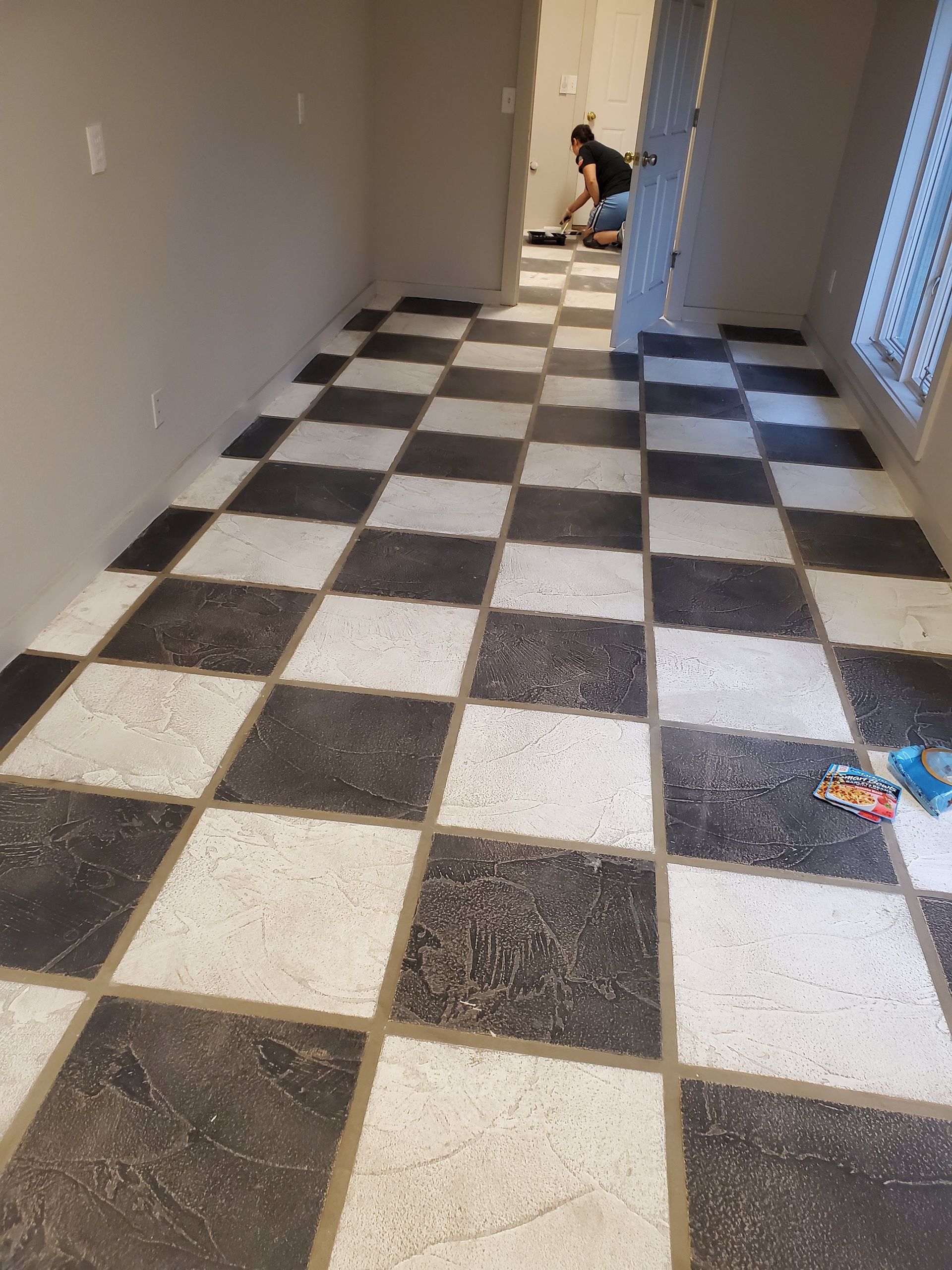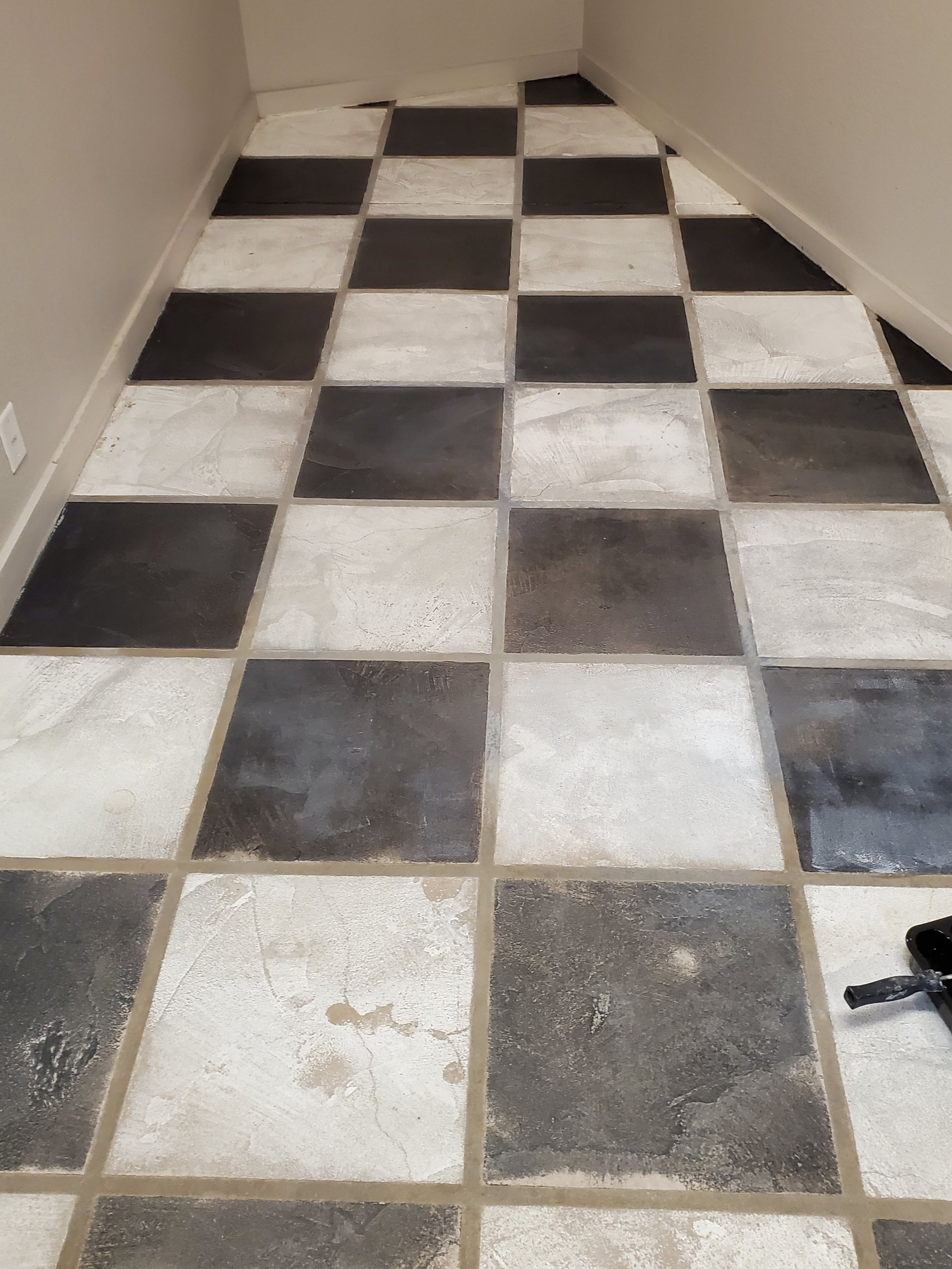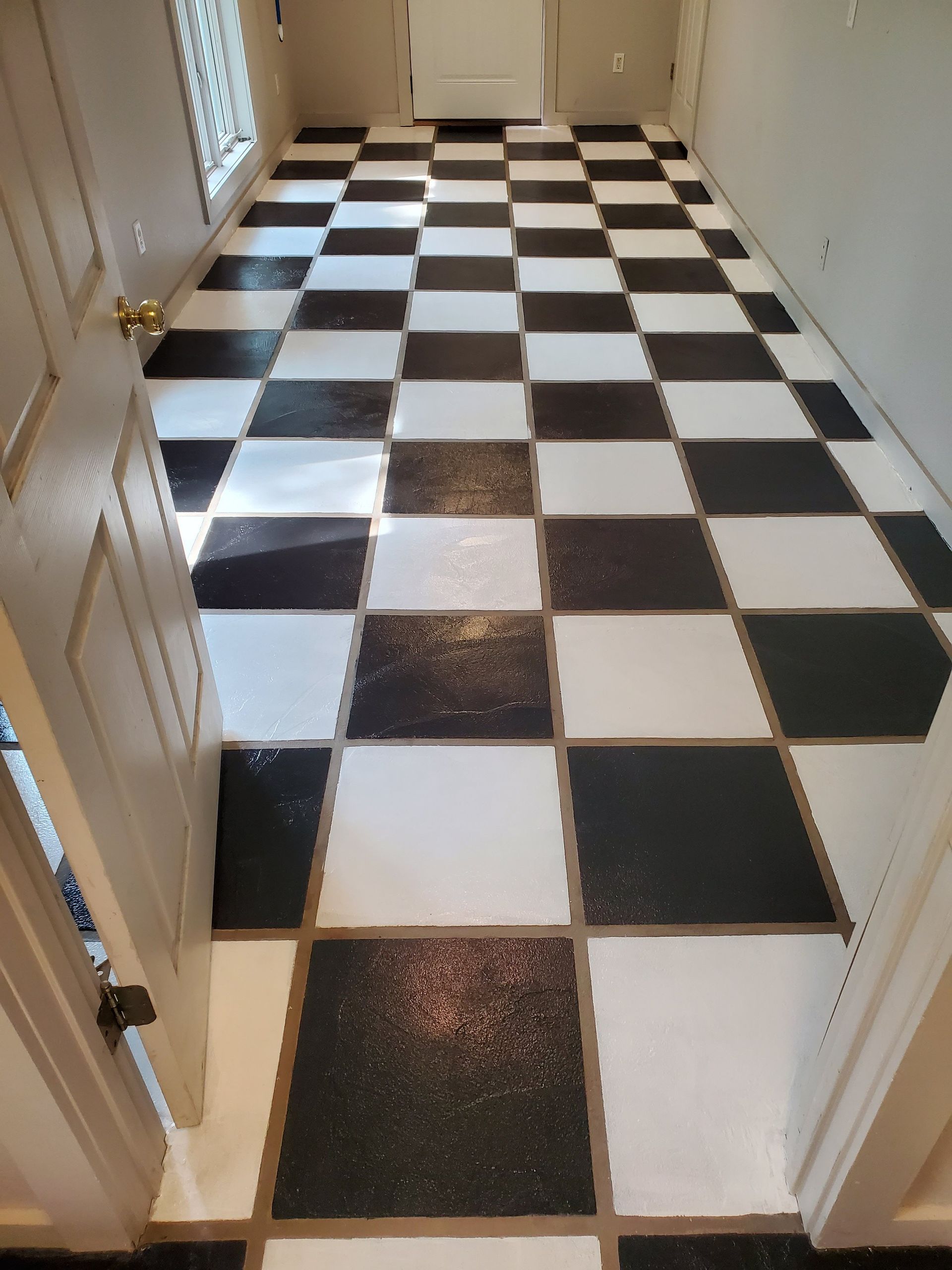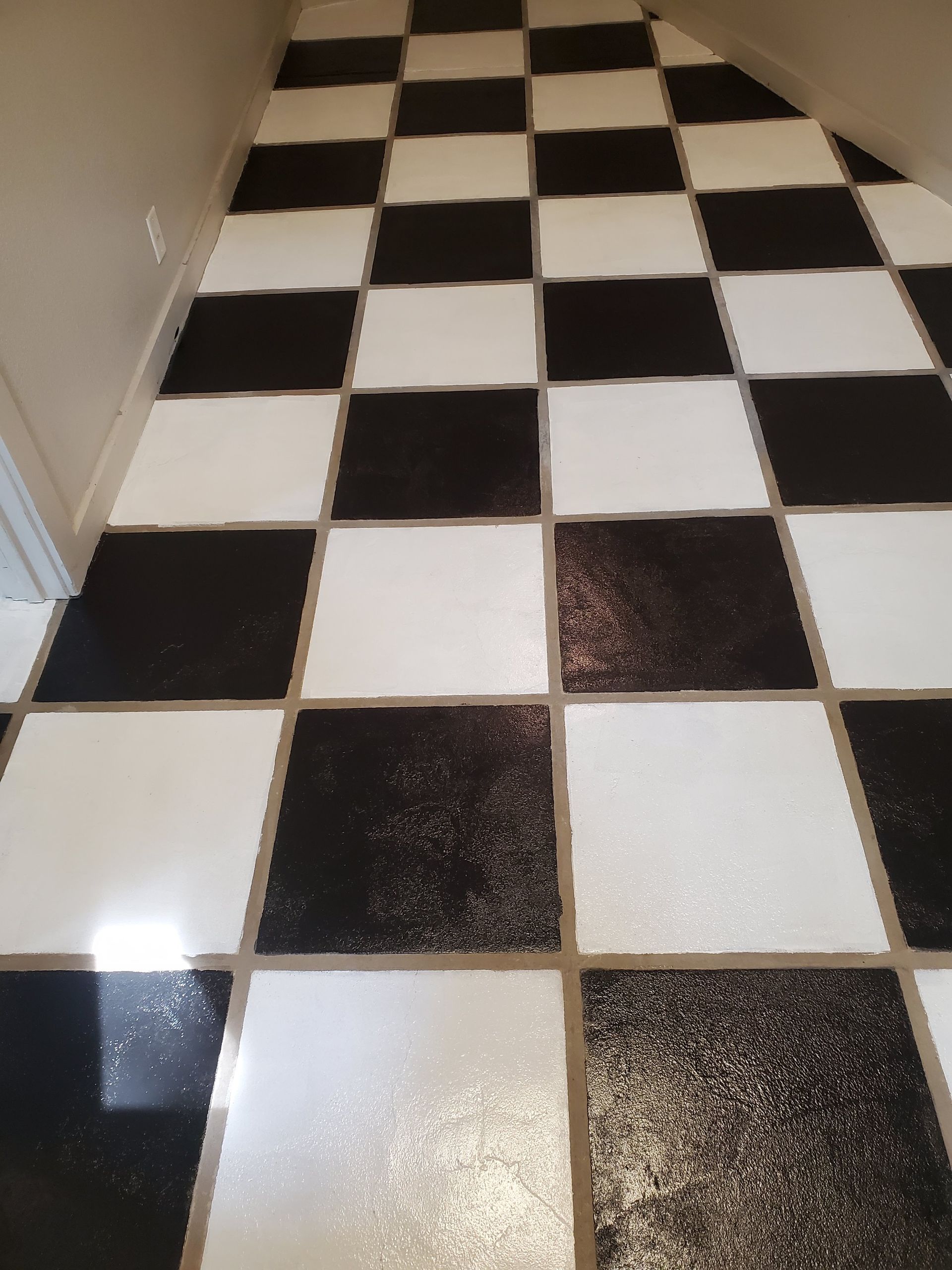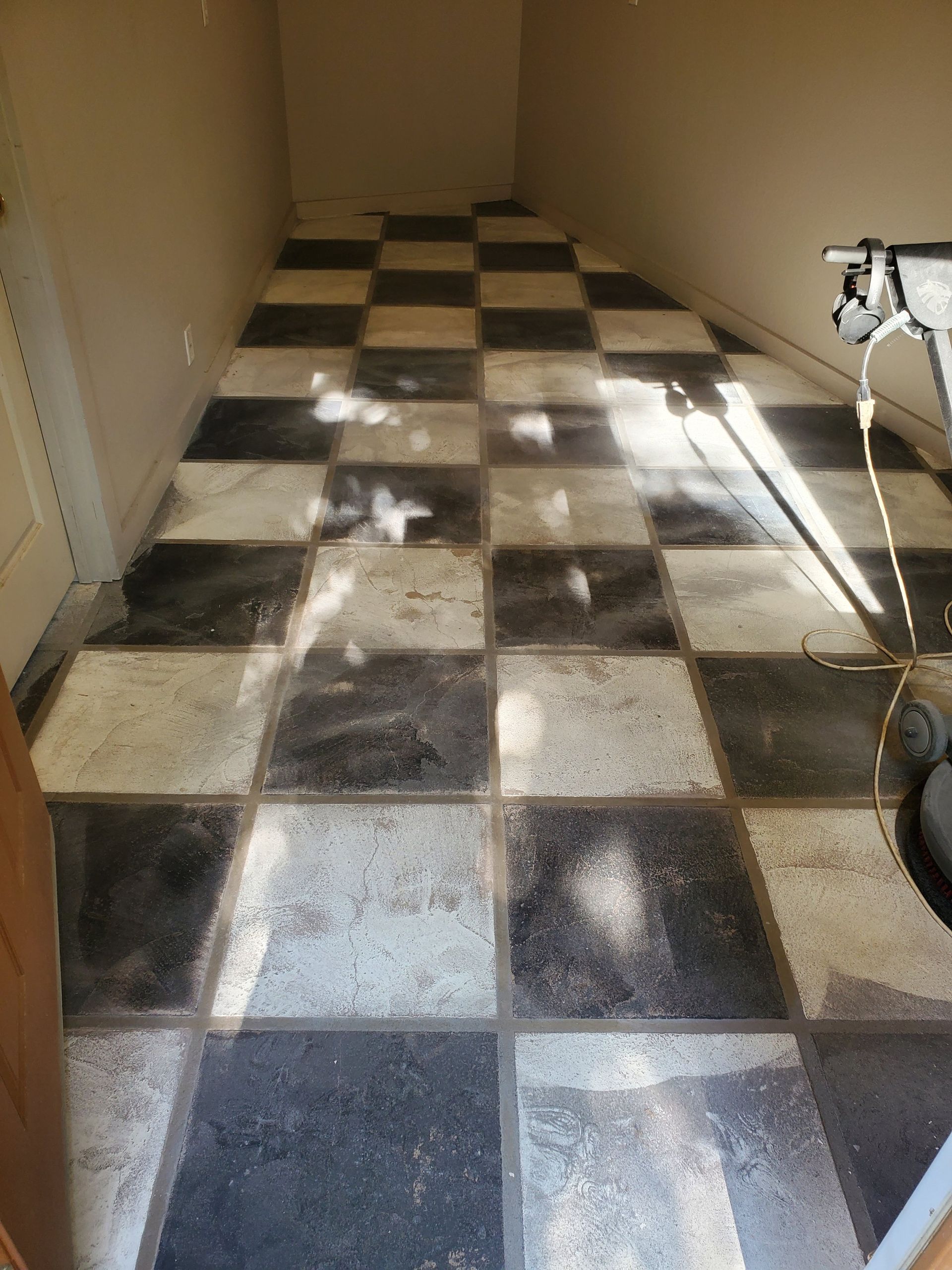 This floor was a Black and White concrete overlay that was completed years ago. We came in and returned the Black to being Black and the White to being White. Then we protected the refurbishment with our BallistiX CounterAttack Topcoat. We added in an antislip additive since this floor was in the boat house of Table Rock Lake.