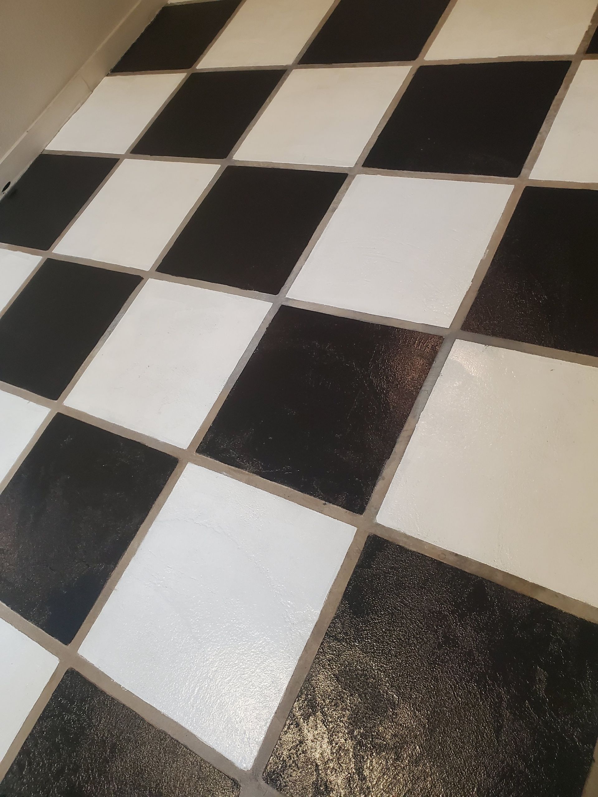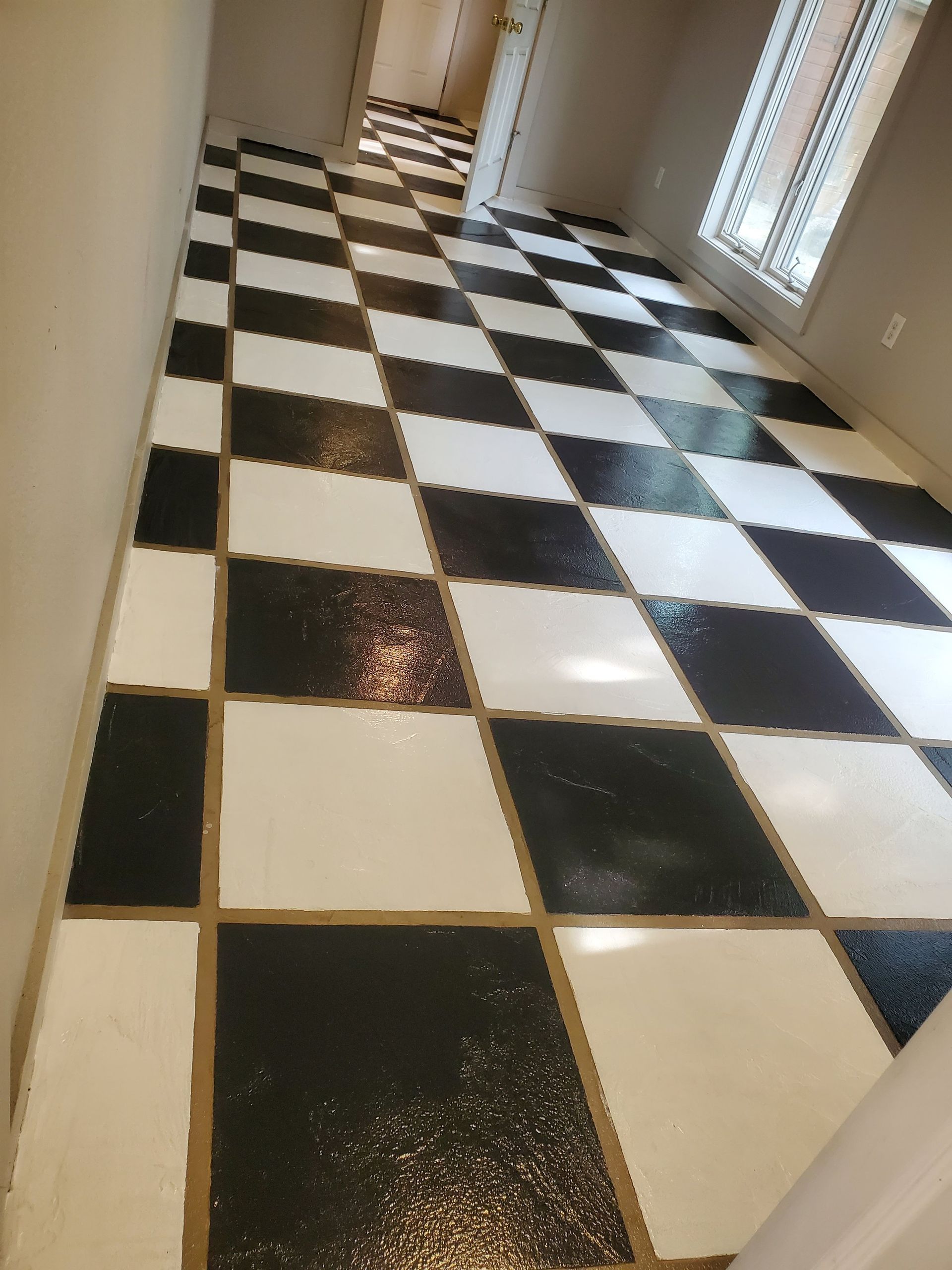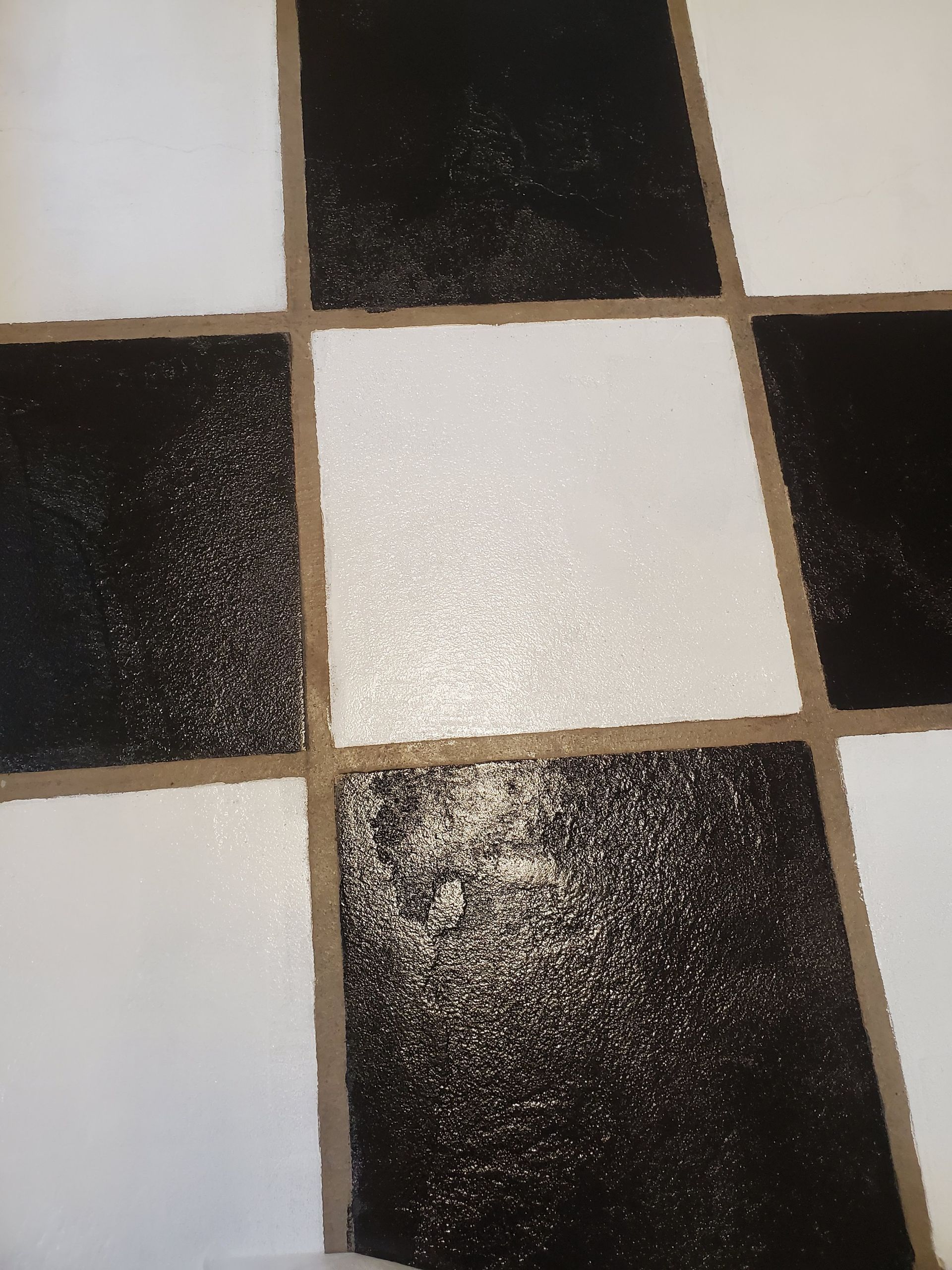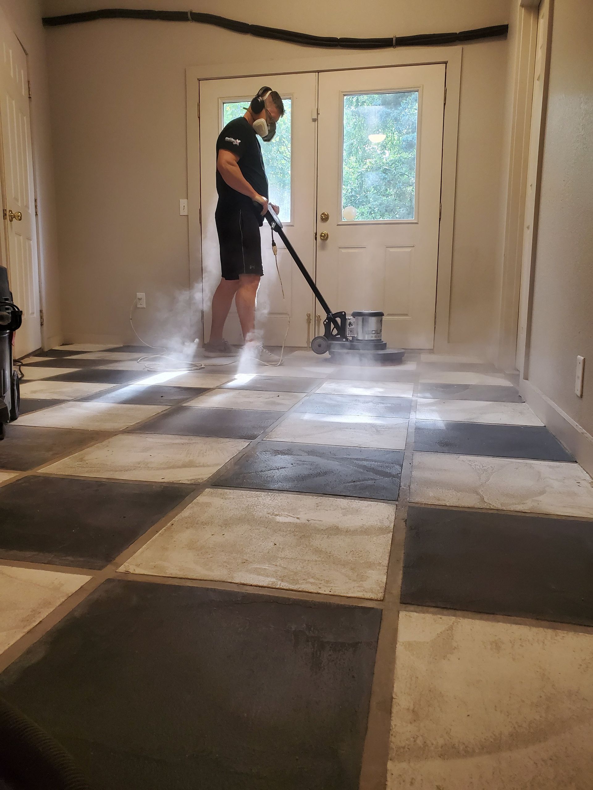 This floor was a Black and White concrete overlay that was completed years ago. We came in and returned the Black to being Black and the White to being White. Then we protected the refurbishment with our BallistiX CounterAttack Topcoat. We added in an antislip additive since this floor was in the boat house of Table Rock Lake.