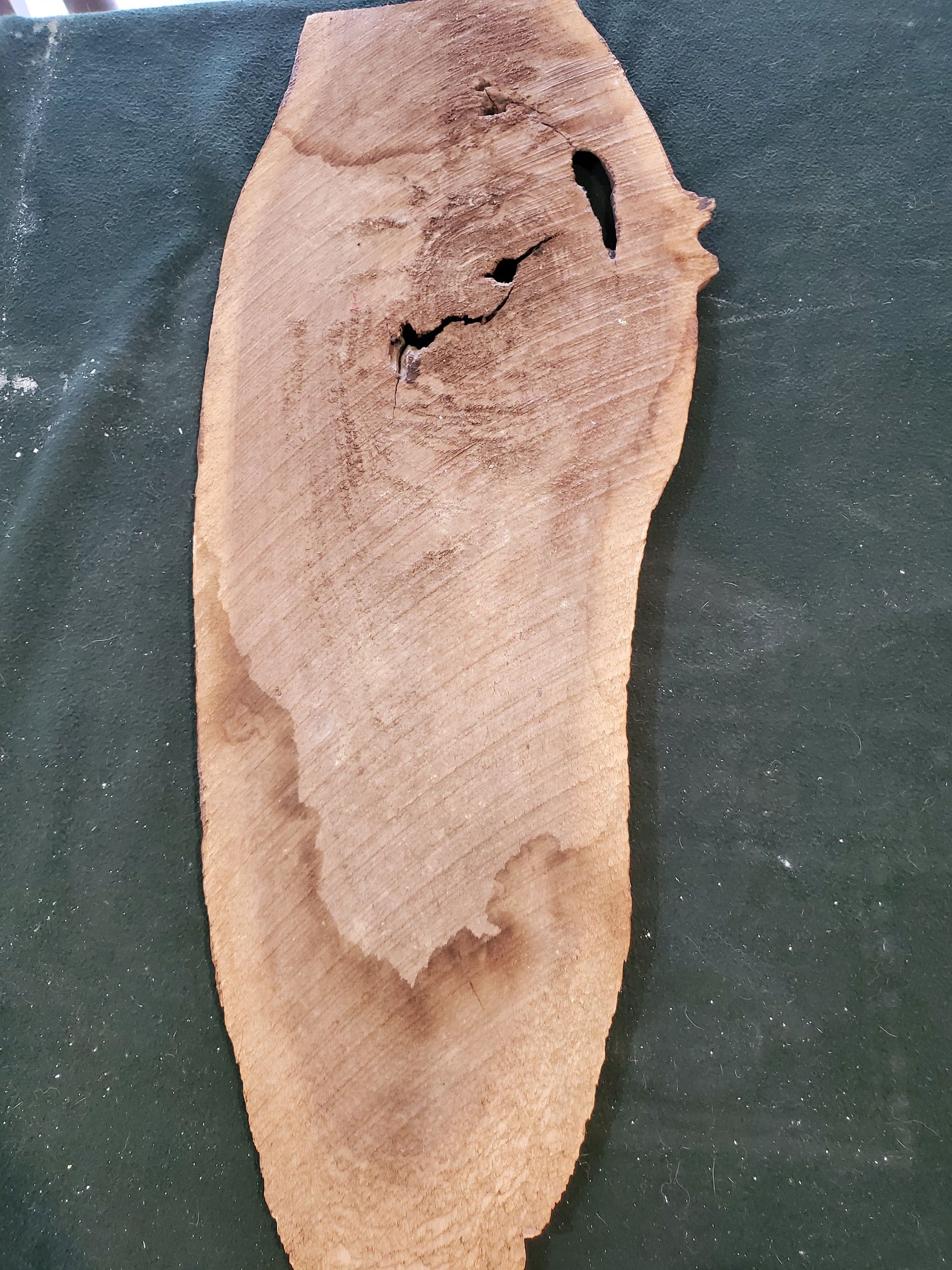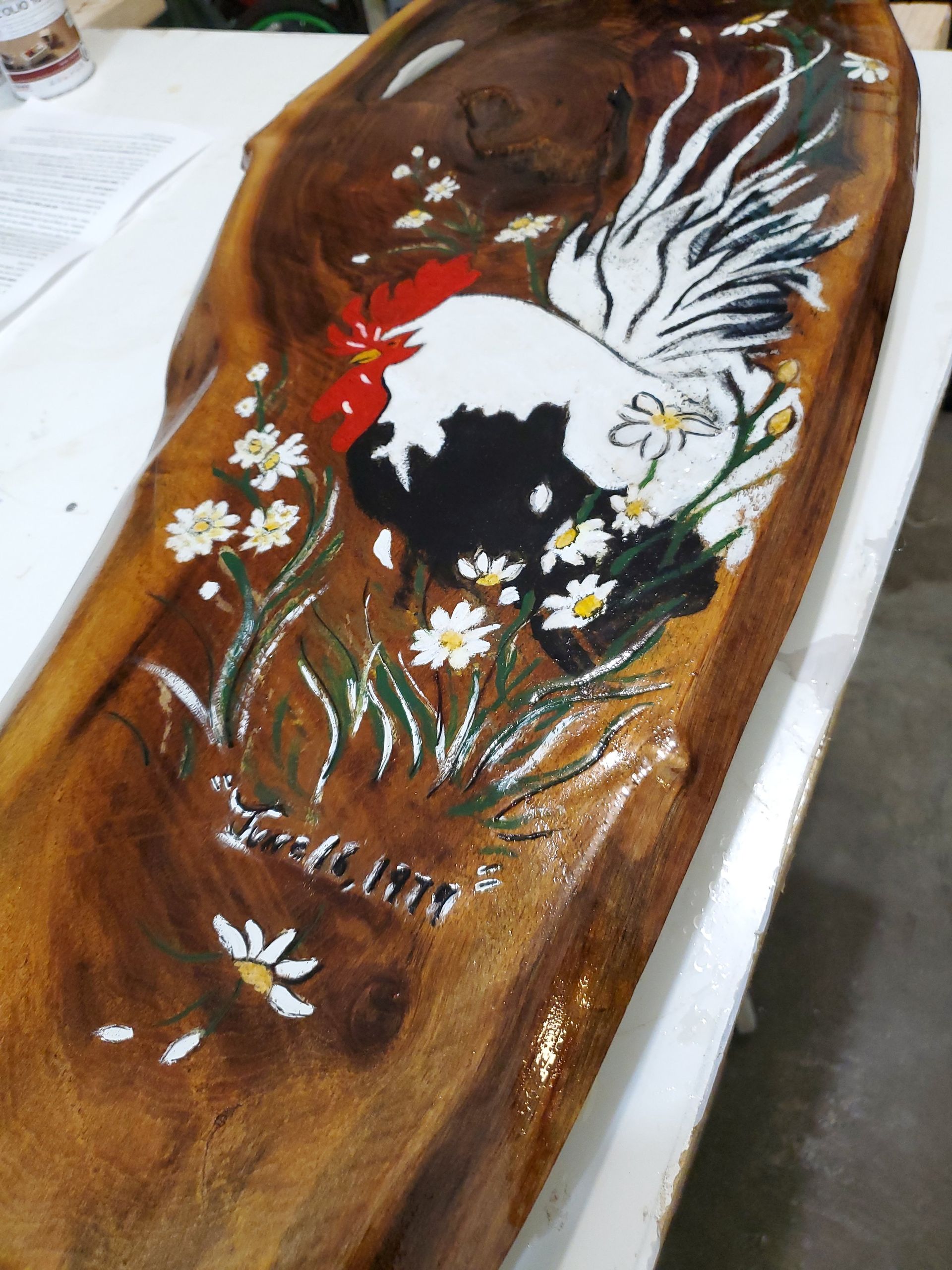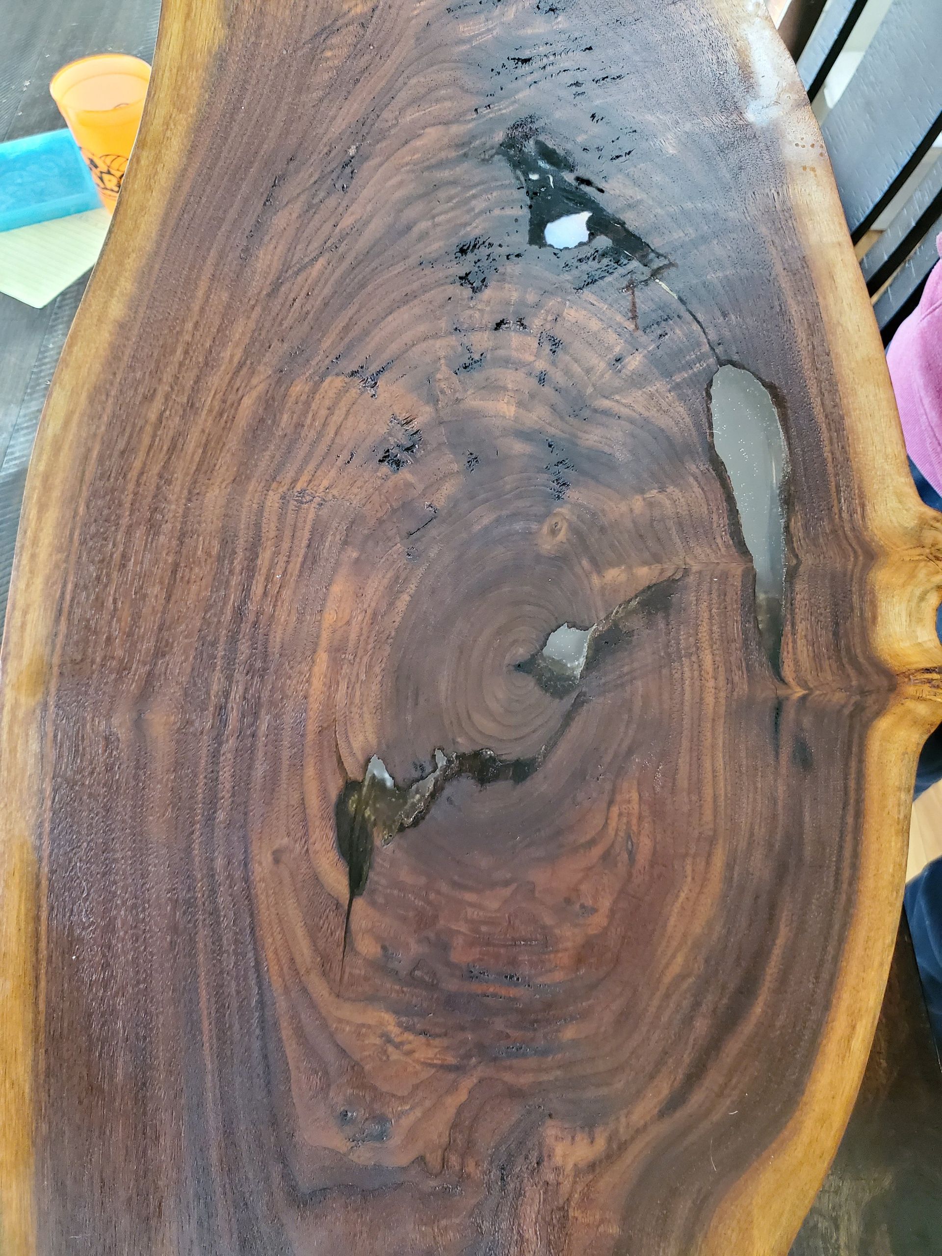 We touched up all the paint, sanded down the wood to a smooth finish, popped the grain, epoxied over the front side of the piece, used our deep pour epoxy to fill the knot holes, and put a final wax seal coat on the piece.