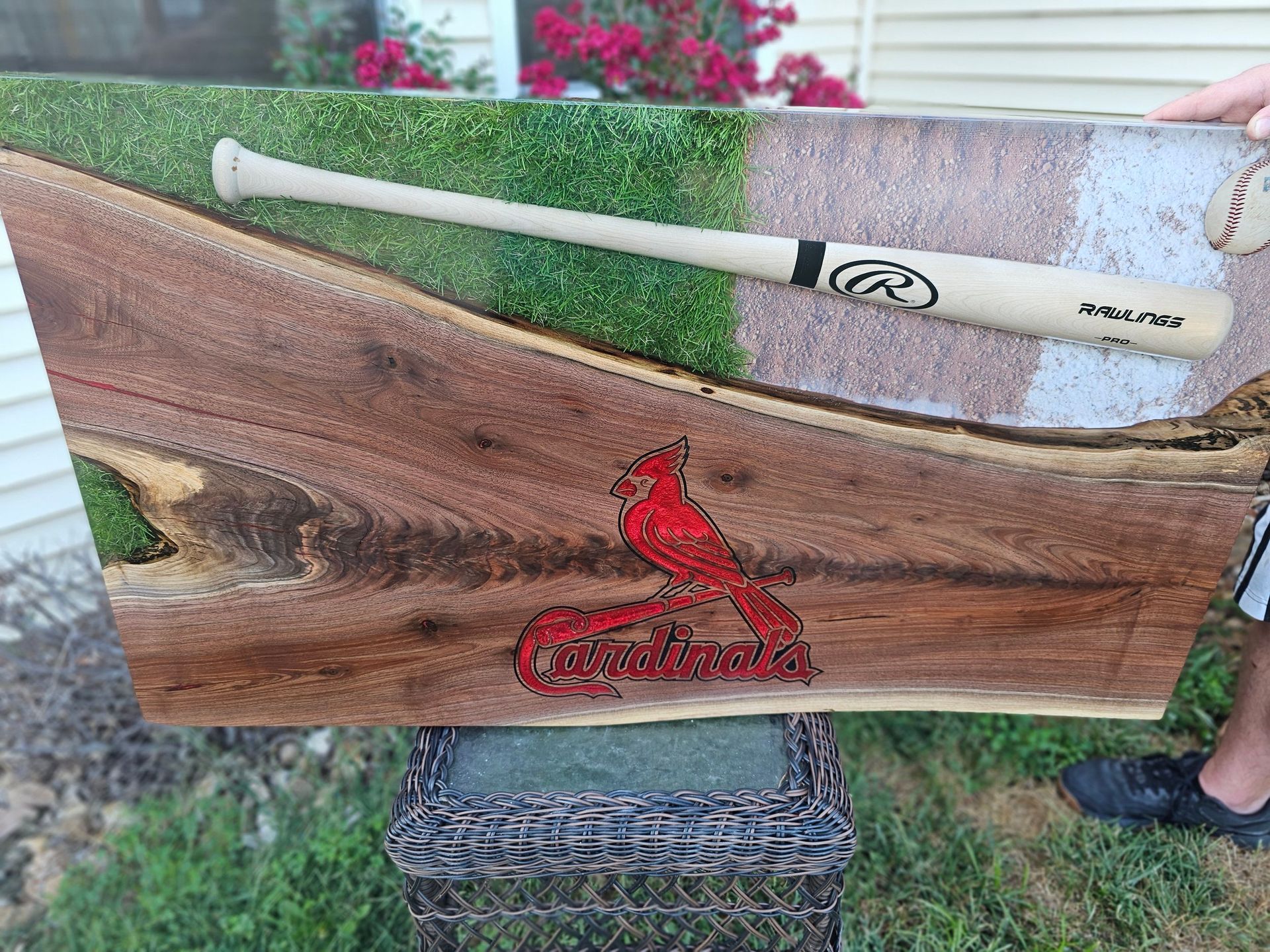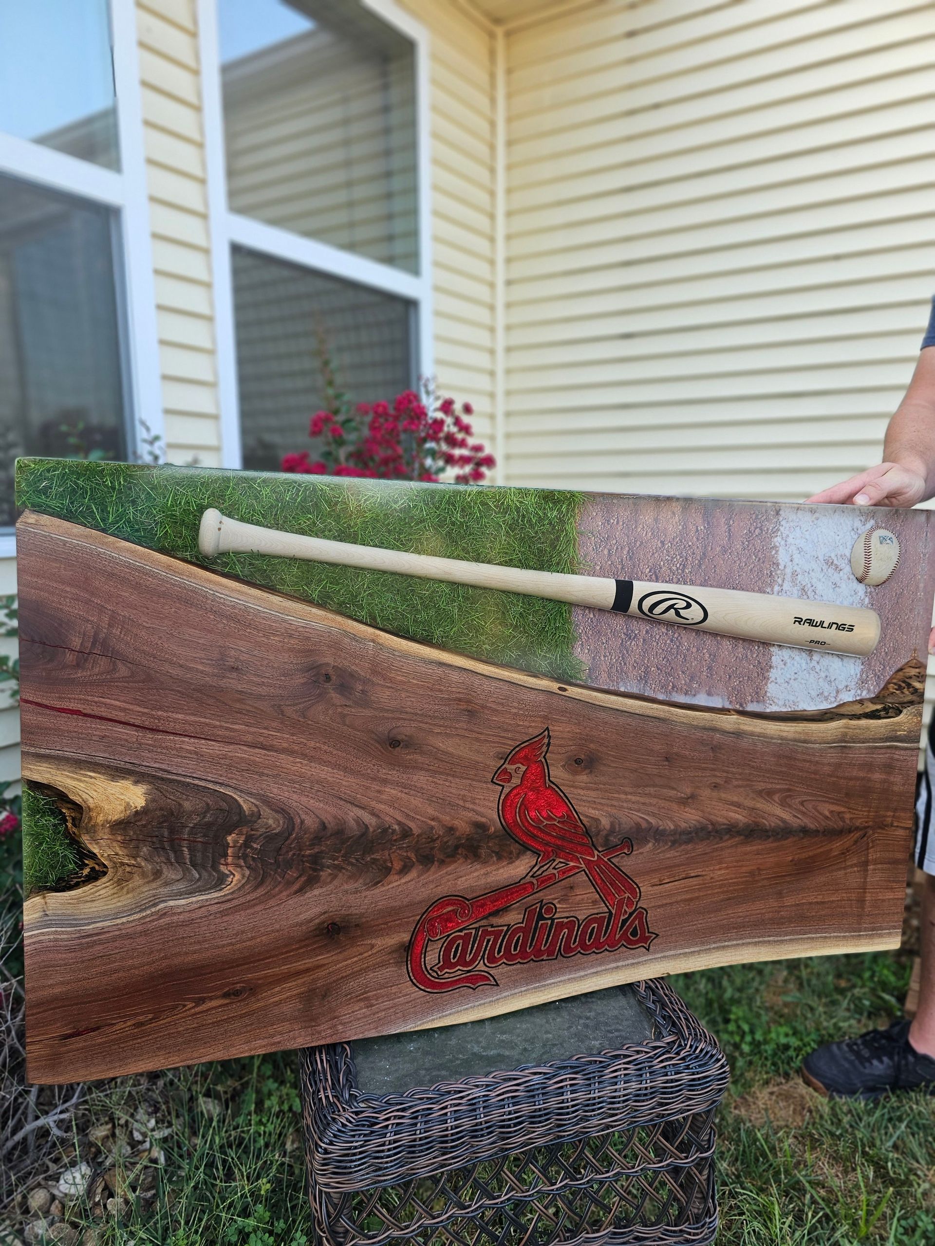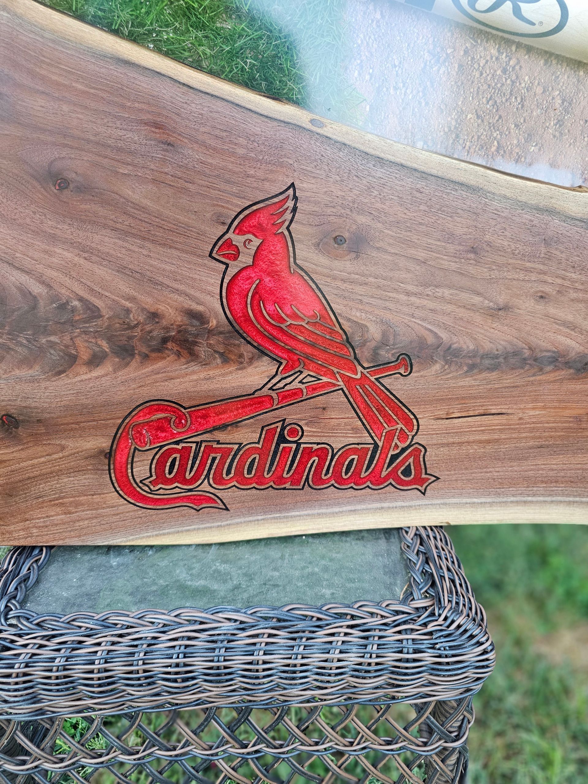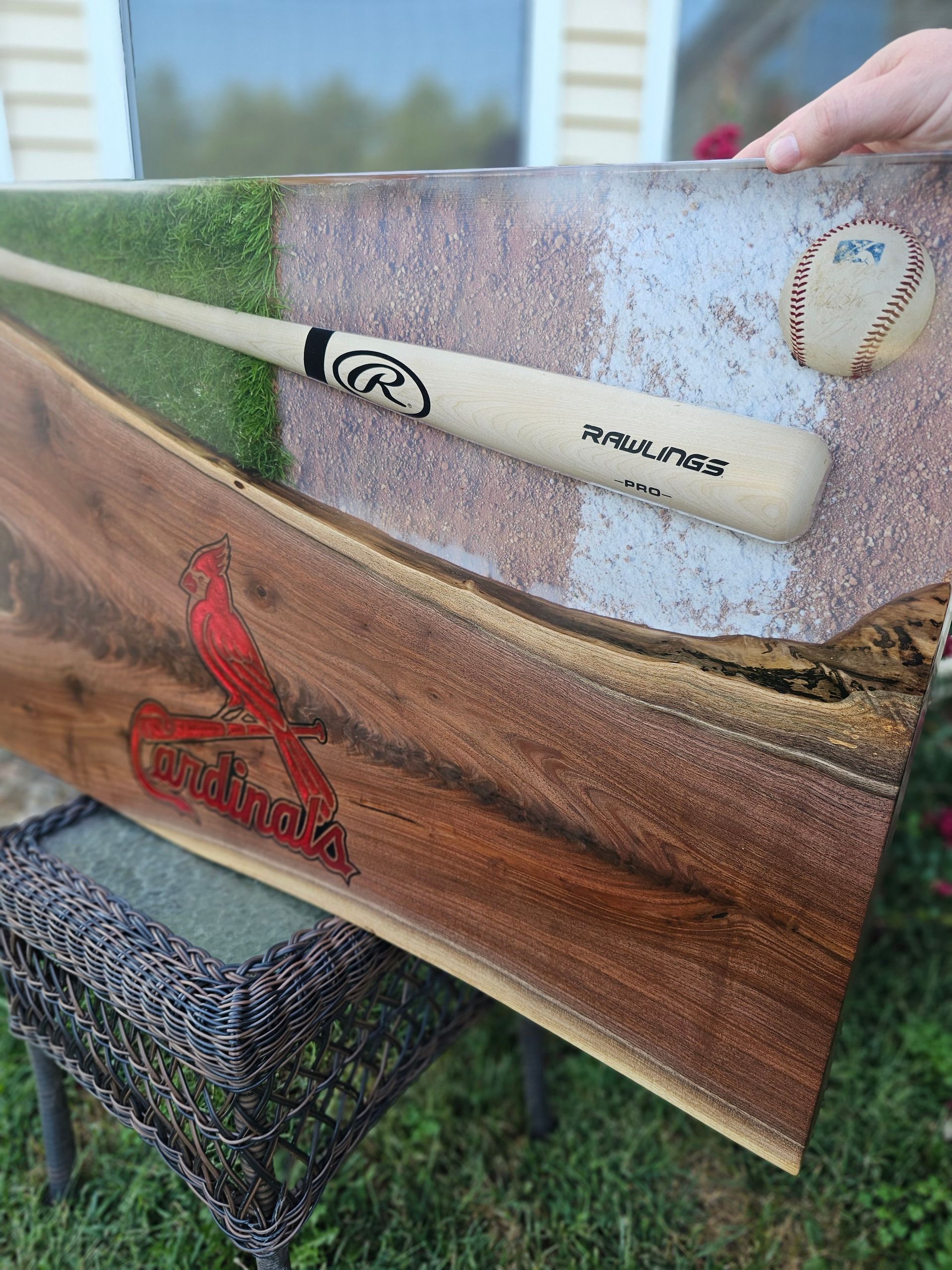 Custom Cardinals Baseball logo engraved in this gorgeous piece of black walnut. The logo is inlaid with red epoxy, while the table boasts a full size baseball bat, ball, and real turf! This epoxy river table uses eye candy pigments, UC Woods Deep Pour Epoxy, the Cardinals MLB logo cut with a CNC, and was donated for 100% of funds raised at auction to go to the Man Up & Go Foundation.