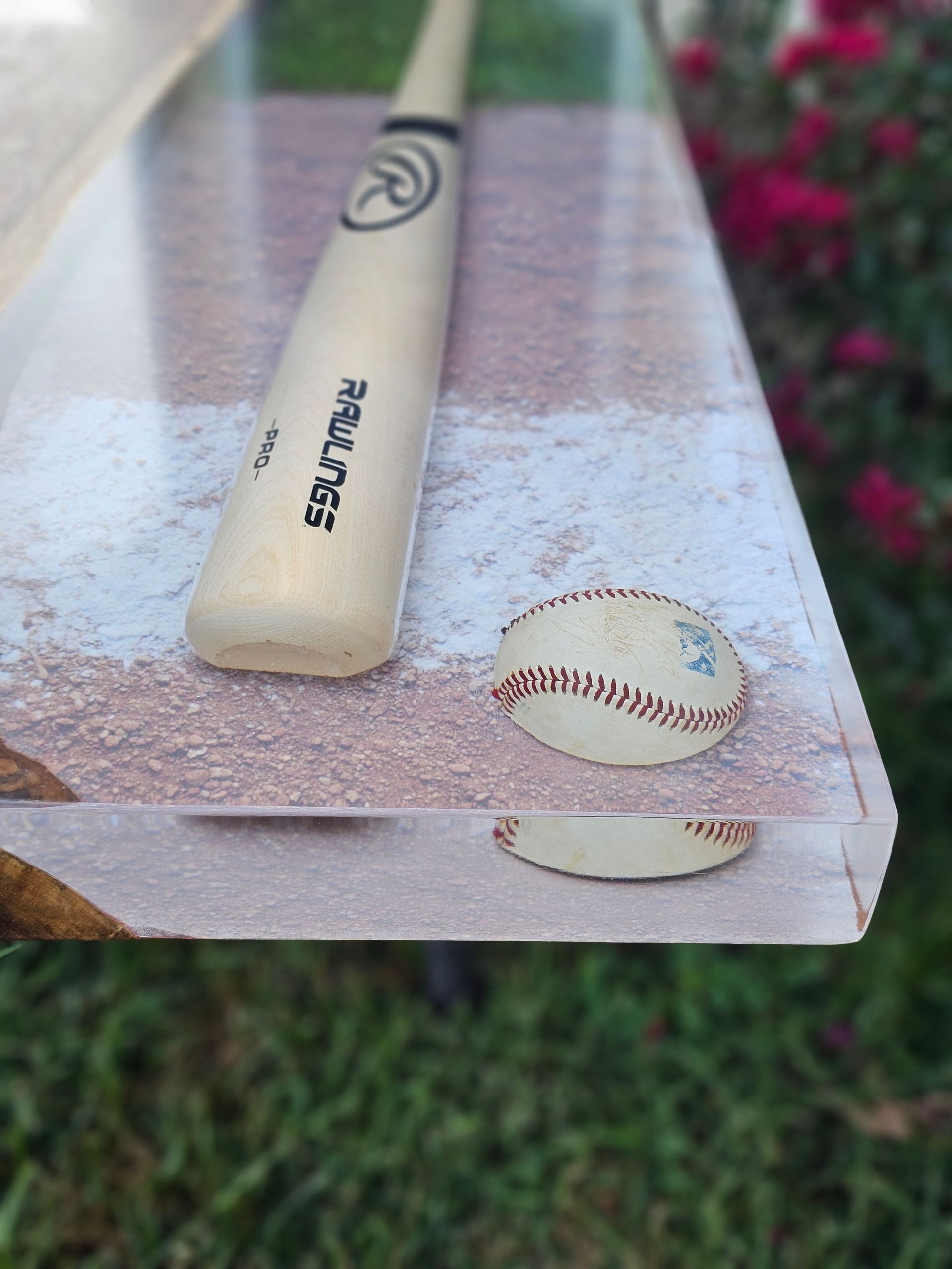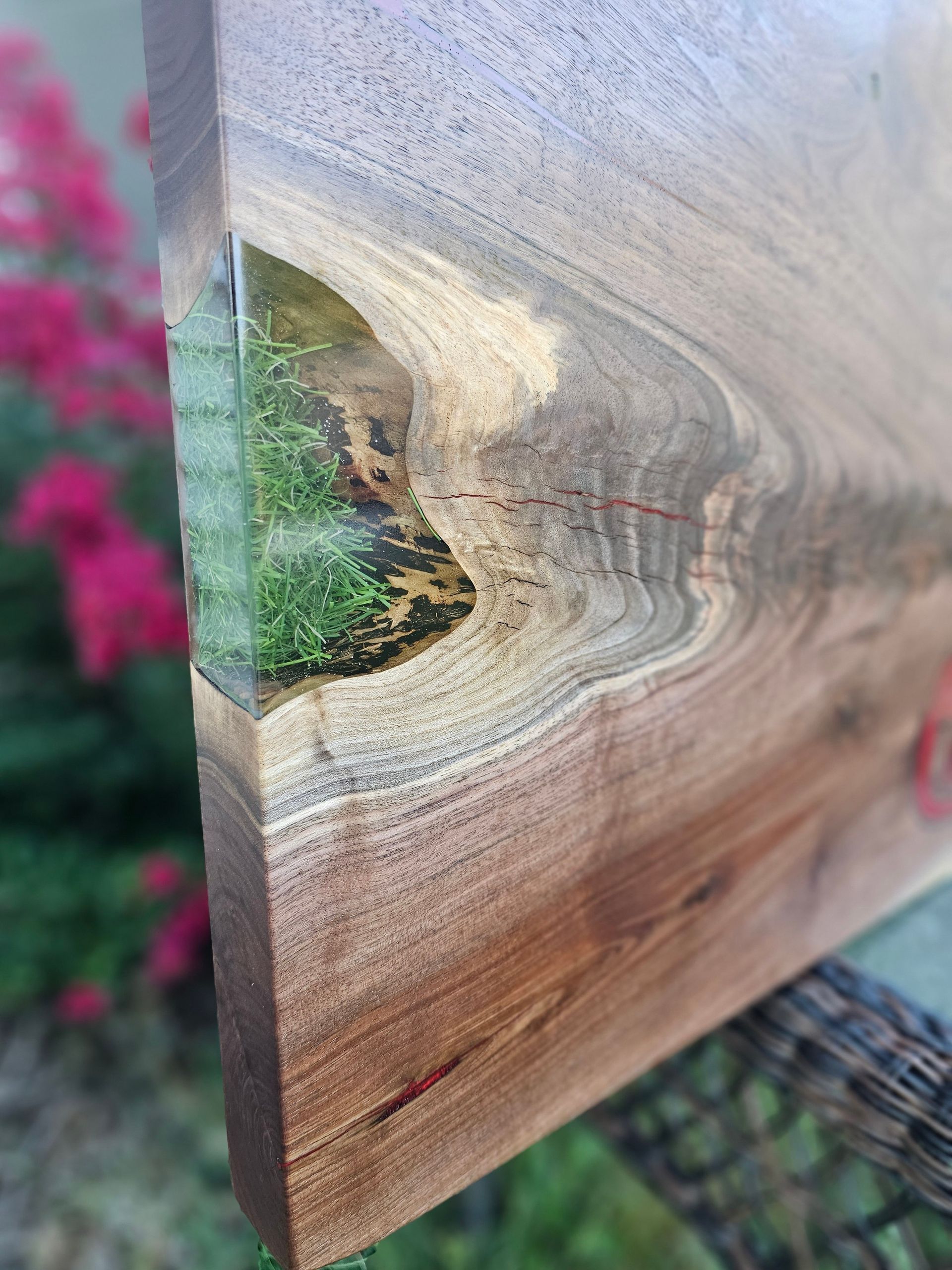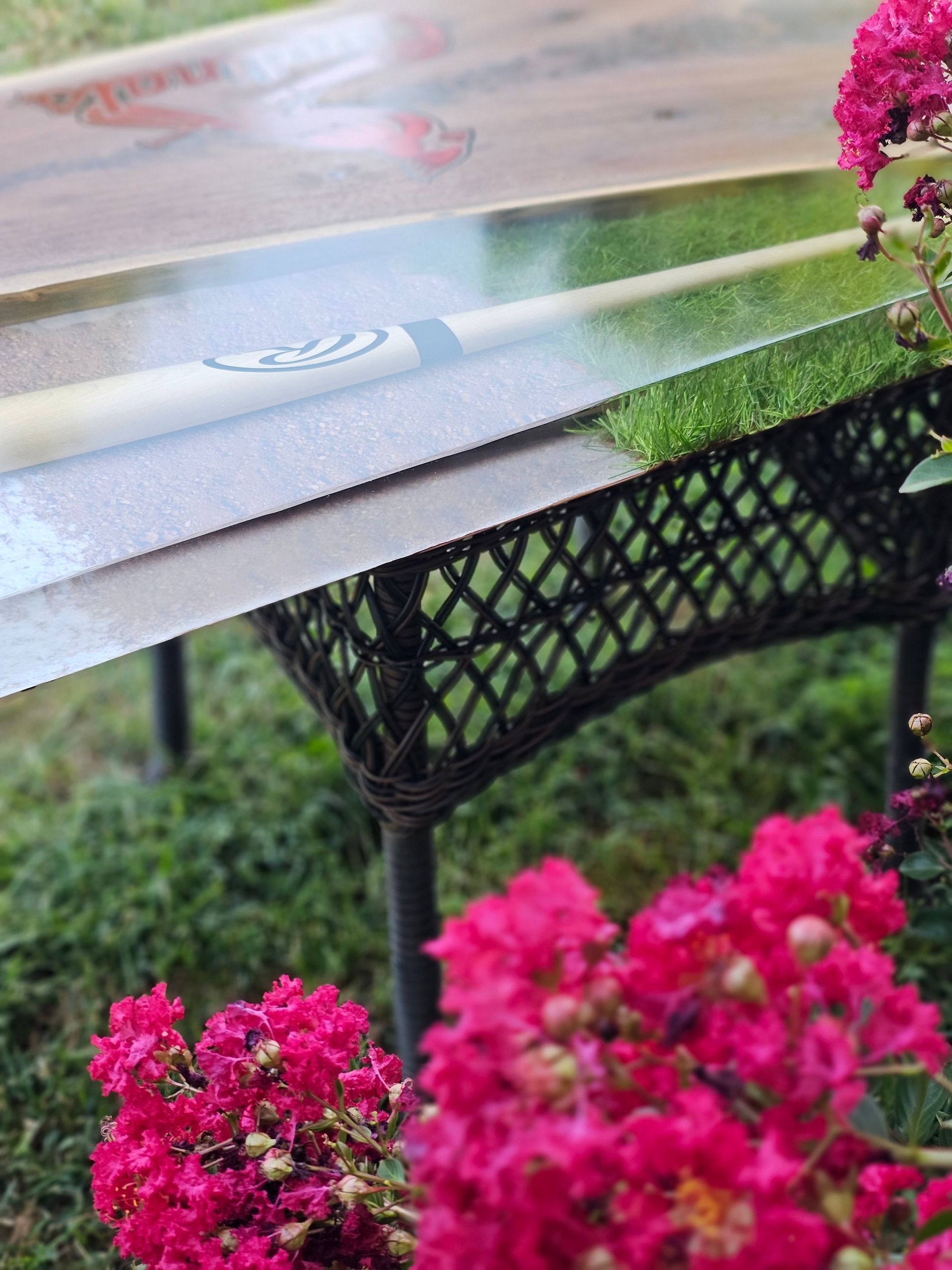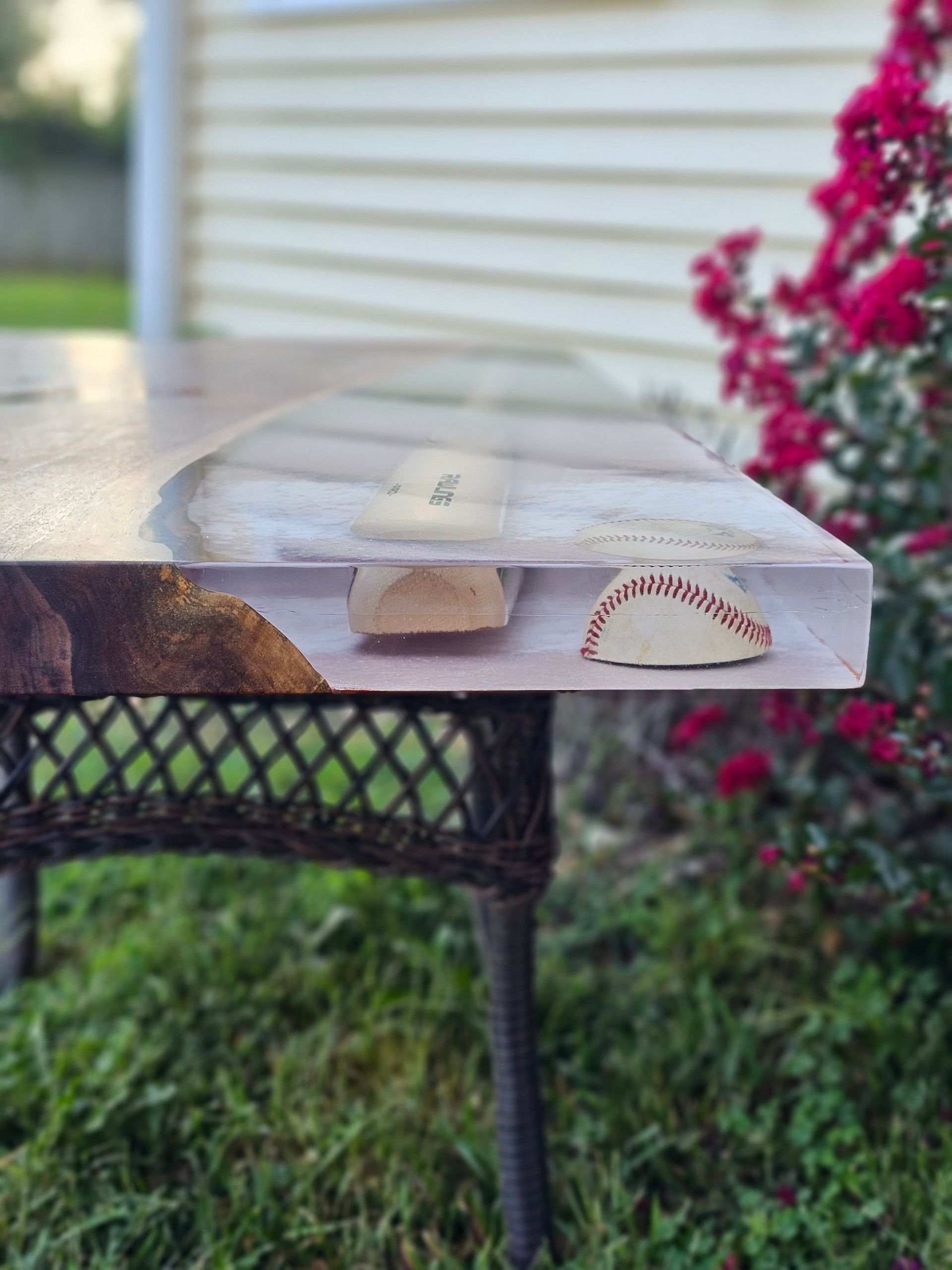Custom Cardinals Baseball logo engraved in this gorgeous piece of black walnut. The logo is inlaid with red epoxy, while the table boasts a full size baseball bat, ball, and real turf! This epoxy river table uses eye candy pigments, UC Woods Deep Pour Epoxy, the Cardinals MLB logo cut with a CNC, and was donated for 100% of funds raised at auction to go to the Man Up & Go Foundation.